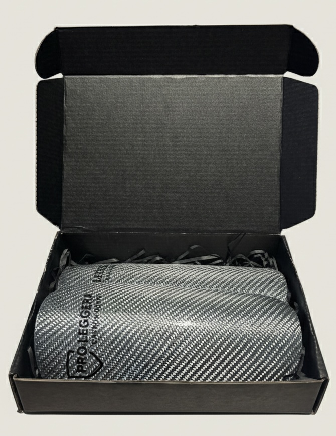 The ProLeggera Silver Guard model features a thin outer layer made from special glass fibers infused with aluminum. This combination creates a distinctive metallic, carbon-style twill appearance, which is an integral part of the guard's hybrid Kevlar/carbon construction.
