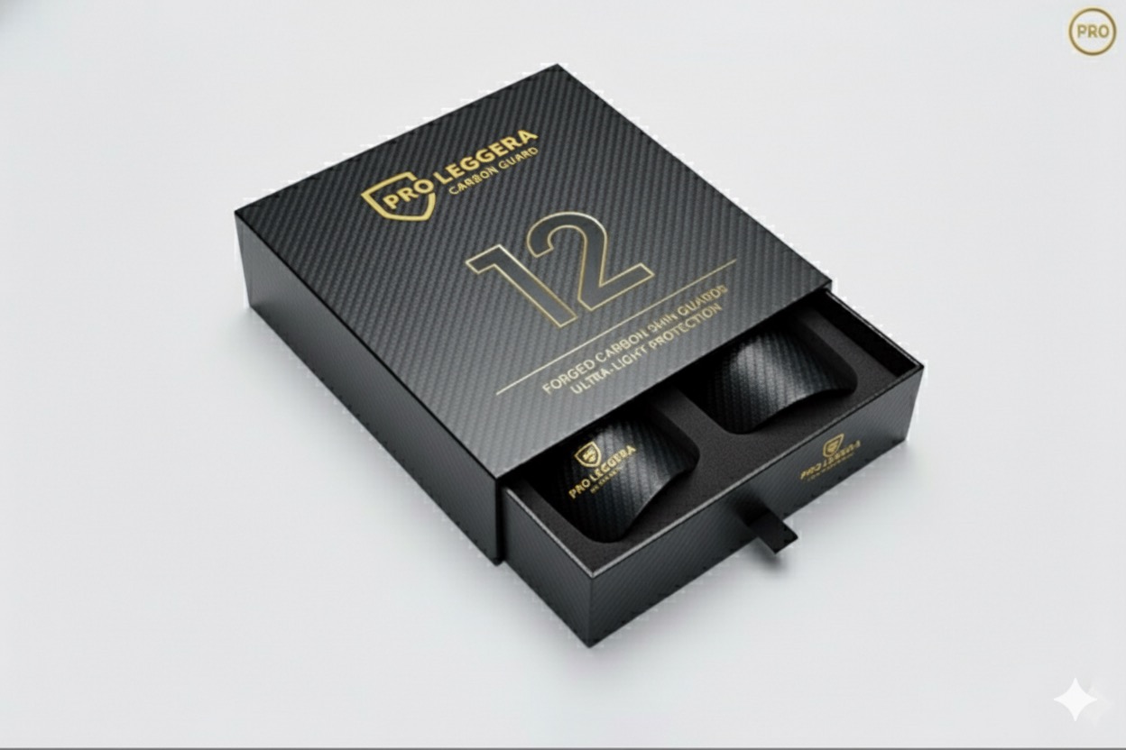Celokarbonová vrstva zajišťuje extrémní pevnost, nízkou hmotnost a odolnost vůči nárazům, což běžné plastové chrániče nedokážou.